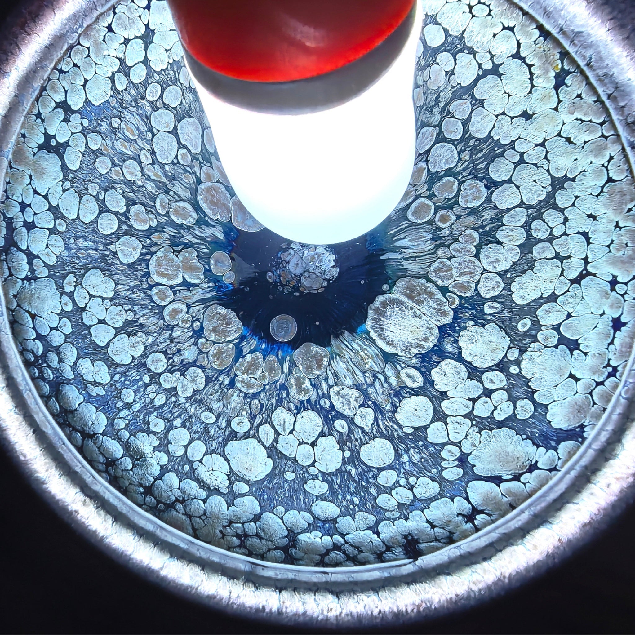 When light touches its surface, star-like crystals shimmer against a profound dark background. The elegant patterns boast radiant hues, large size, striking three-dimensionality, and a textured tactile surface with distinct layers. Its egg-shaped form showcases breathtaking kiln-generated films in blue, green, purple, and gold—each with a sublime vitrified finish and metallic glow.