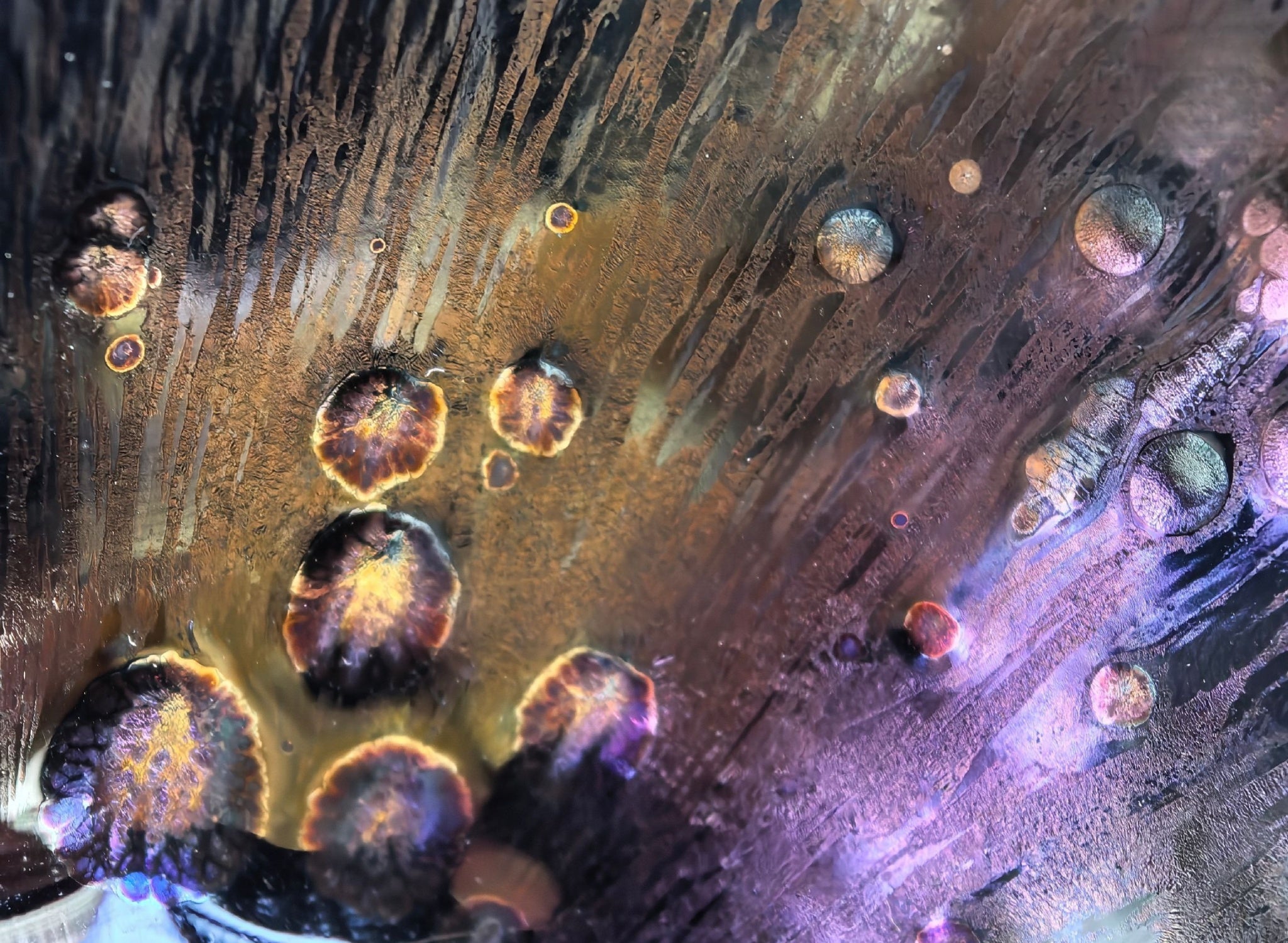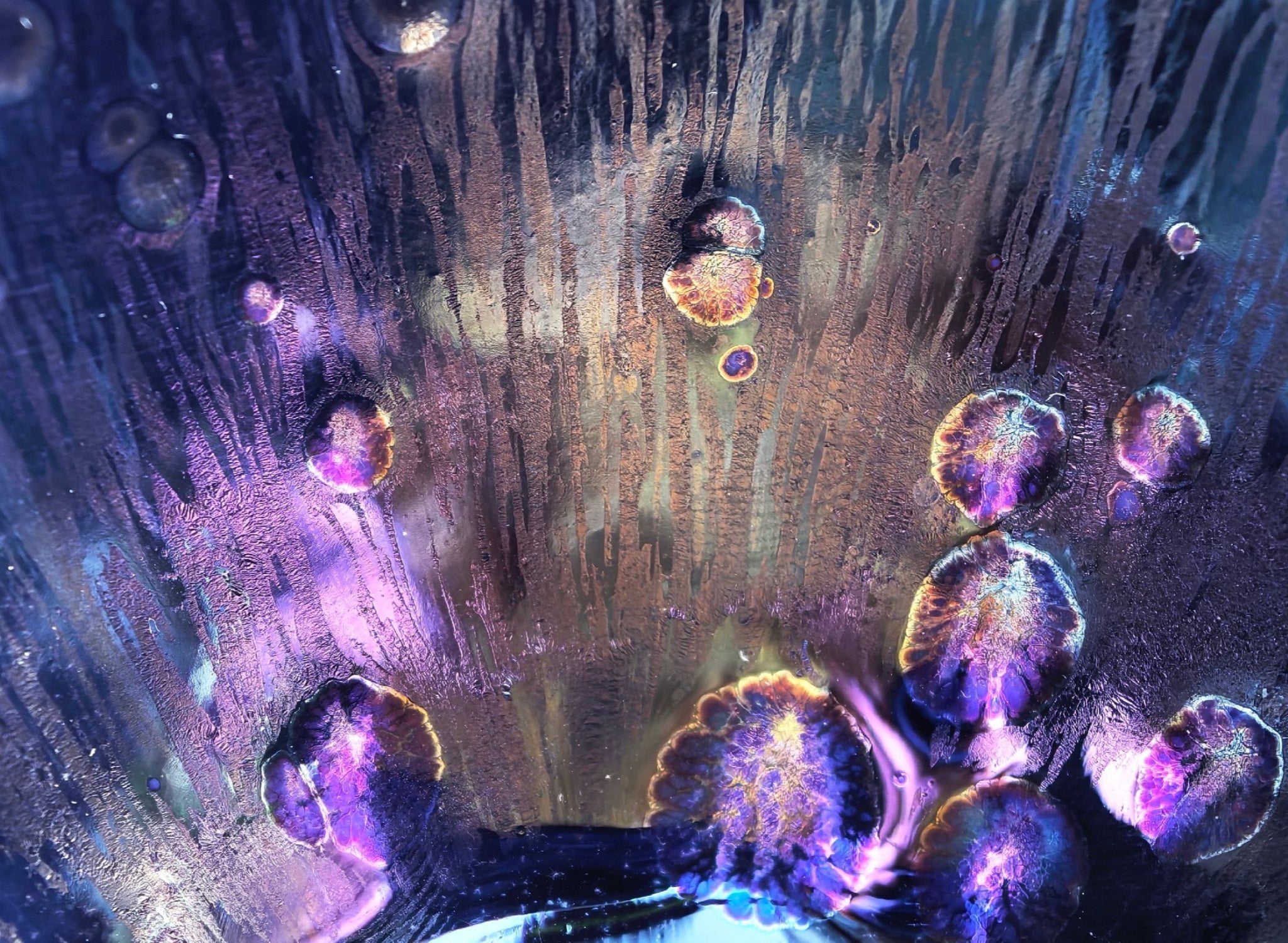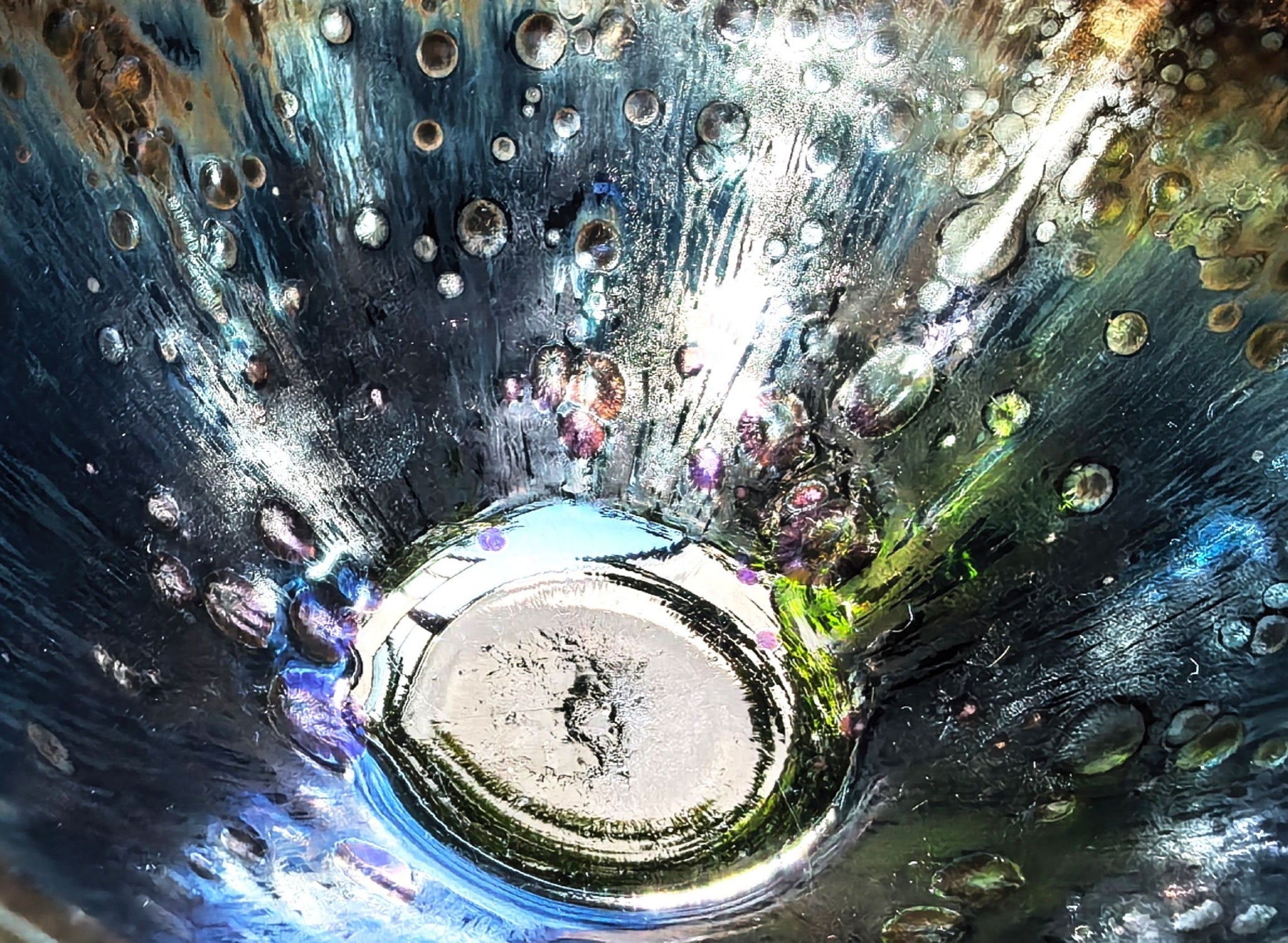 When light touches its surface, star-like crystals shimmer against a profound dark background. The elegant patterns boast radiant hues, large size, striking three-dimensionality, and a textured tactile surface with distinct layers. Its egg-shaped form showcases breathtaking kiln-generated films in blue, green, purple, and gold—each with a sublime vitrified finish and metallic glow.