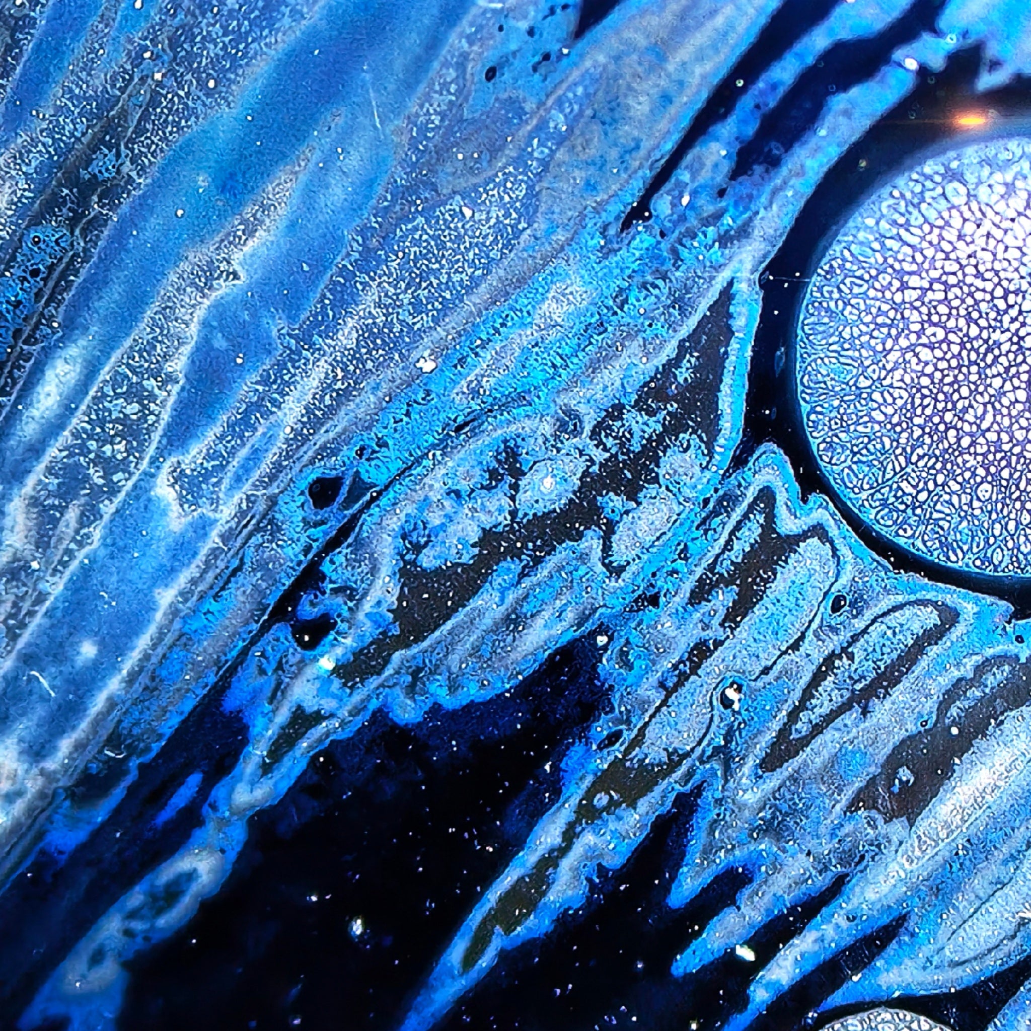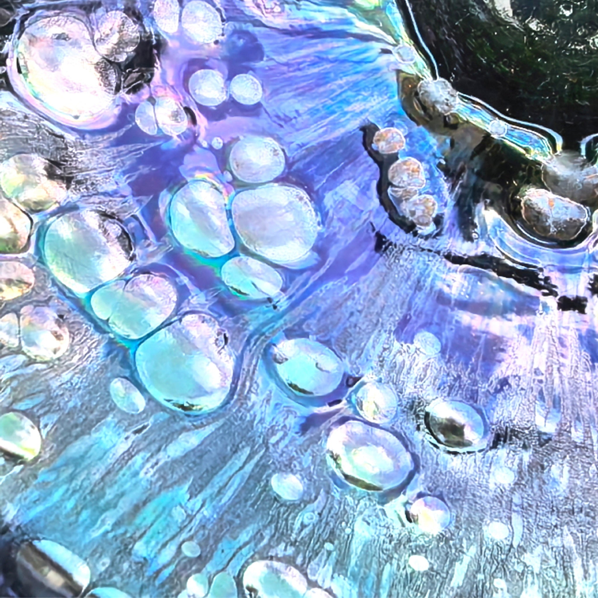 When light touches its surface, star-like crystals shimmer against a profound dark background. The elegant patterns boast radiant hues, large size, striking three-dimensionality, and a textured tactile surface with distinct layers. Its egg-shaped form showcases breathtaking kiln-generated films in blue, green, purple, and gold—each with a sublime vitrified finish and metallic glow.