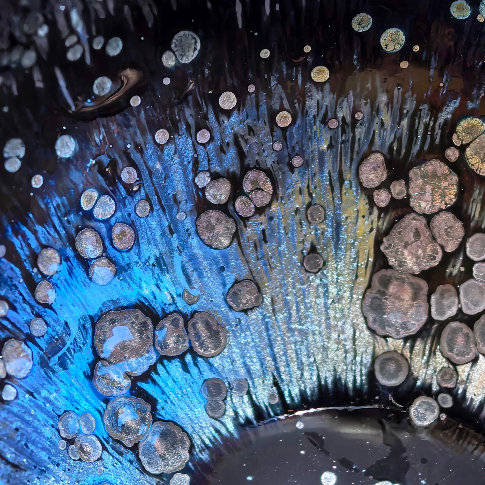 Through carefully controlled oxygen intake, stunning natural patterns emerge—reminiscent of meteorite craters and cosmic auroras. The deep black glaze transitions gently to a jade-like rim, with lush glaze texture and dramatic dripping effects. What makes each cup truly one-of-a-kind are the vibrant and unpredictable colors formed by mineral traces and firewood elements reacting under intense heat. Its position in the kiln further shapes its unique visual story—making no two pieces alike.