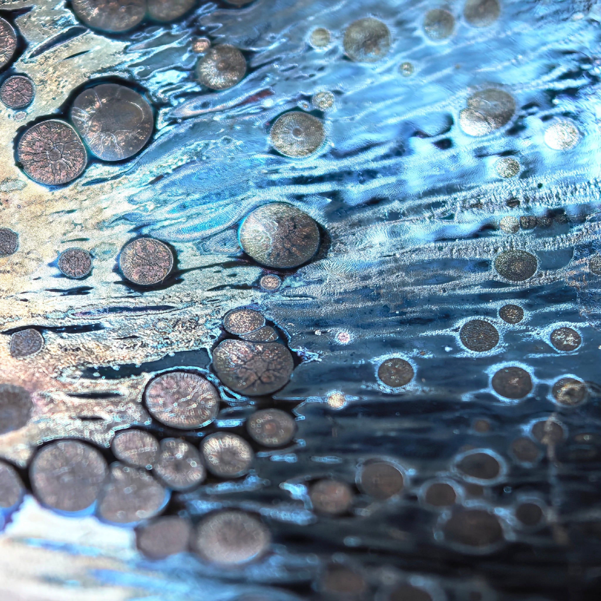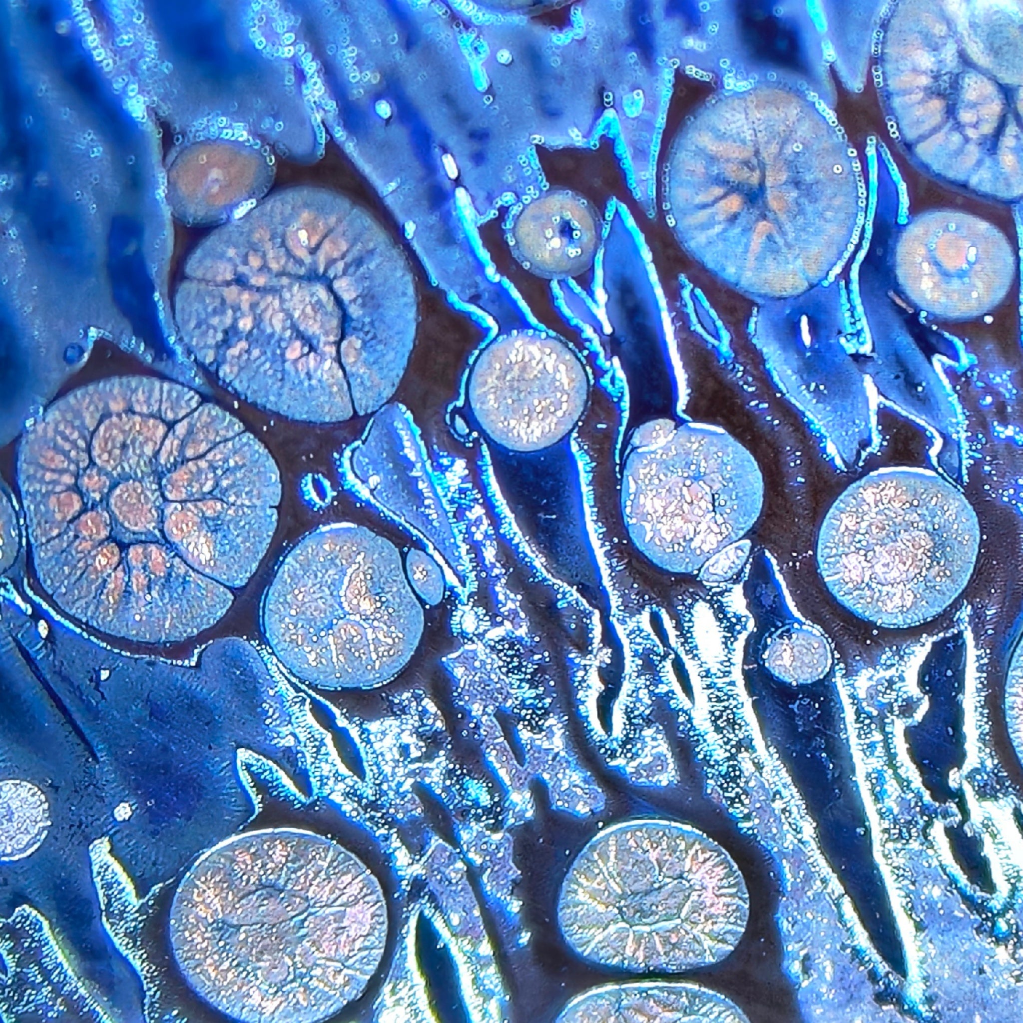 When light touches its surface, star-like crystals shimmer against a profound dark background. The elegant patterns boast radiant hues, large size, striking three-dimensionality, and a textured tactile surface with distinct layers. Its egg-shaped form showcases breathtaking kiln-generated films in blue, green, purple, and gold—each with a sublime vitrified finish and metallic glow.