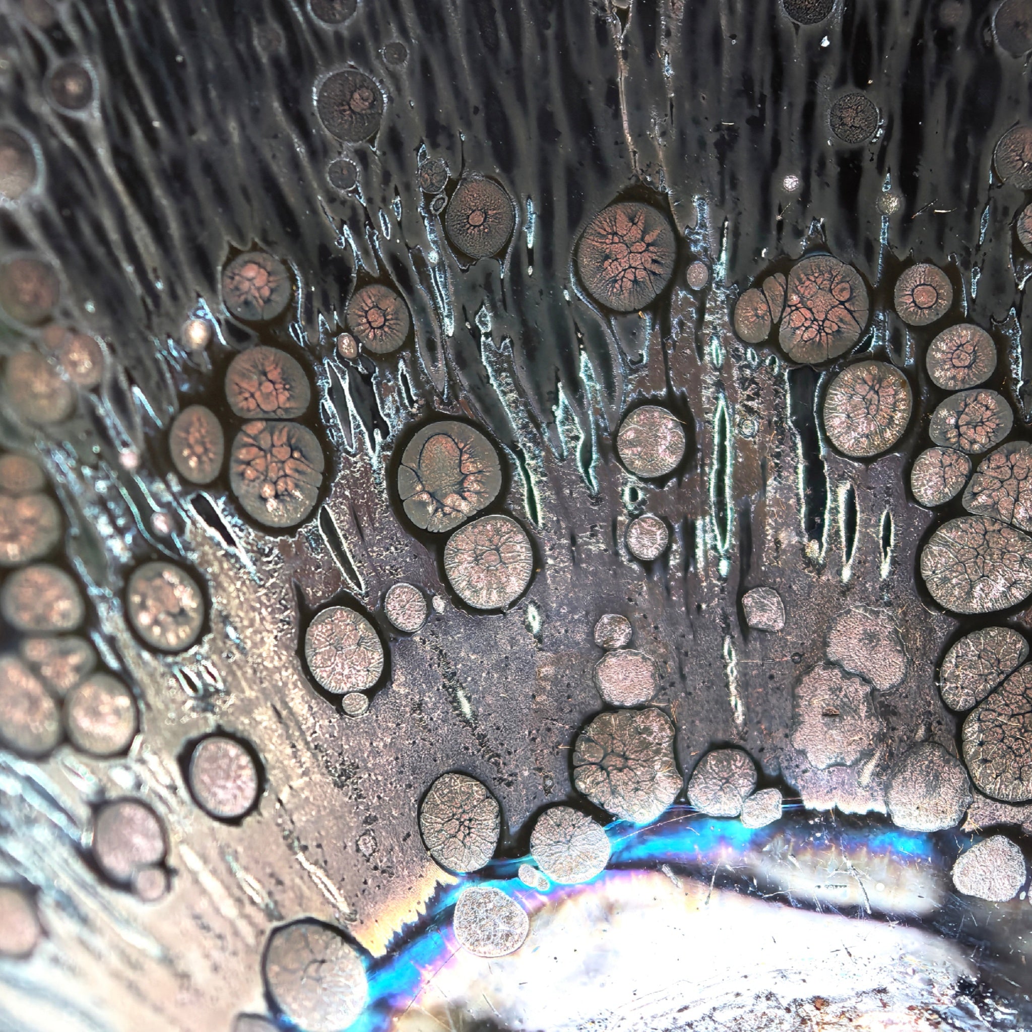 Through carefully controlled oxygen intake, stunning natural patterns emerge—reminiscent of meteorite craters and cosmic auroras. The deep black glaze transitions gently to a jade-like rim, with lush glaze texture and dramatic dripping effects. What makes each cup truly one-of-a-kind are the vibrant and unpredictable colors formed by mineral traces and firewood elements reacting under intense heat. Its position in the kiln further shapes its unique visual story—making no two pieces alike.