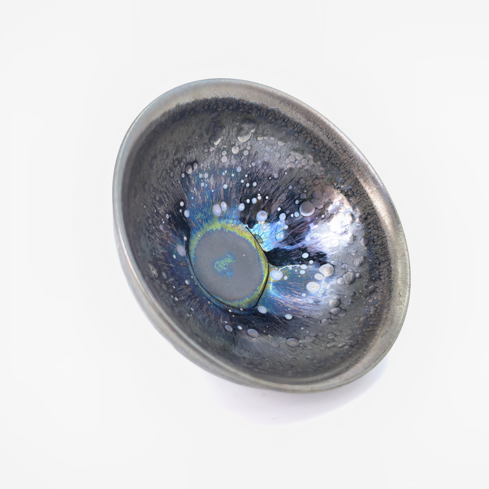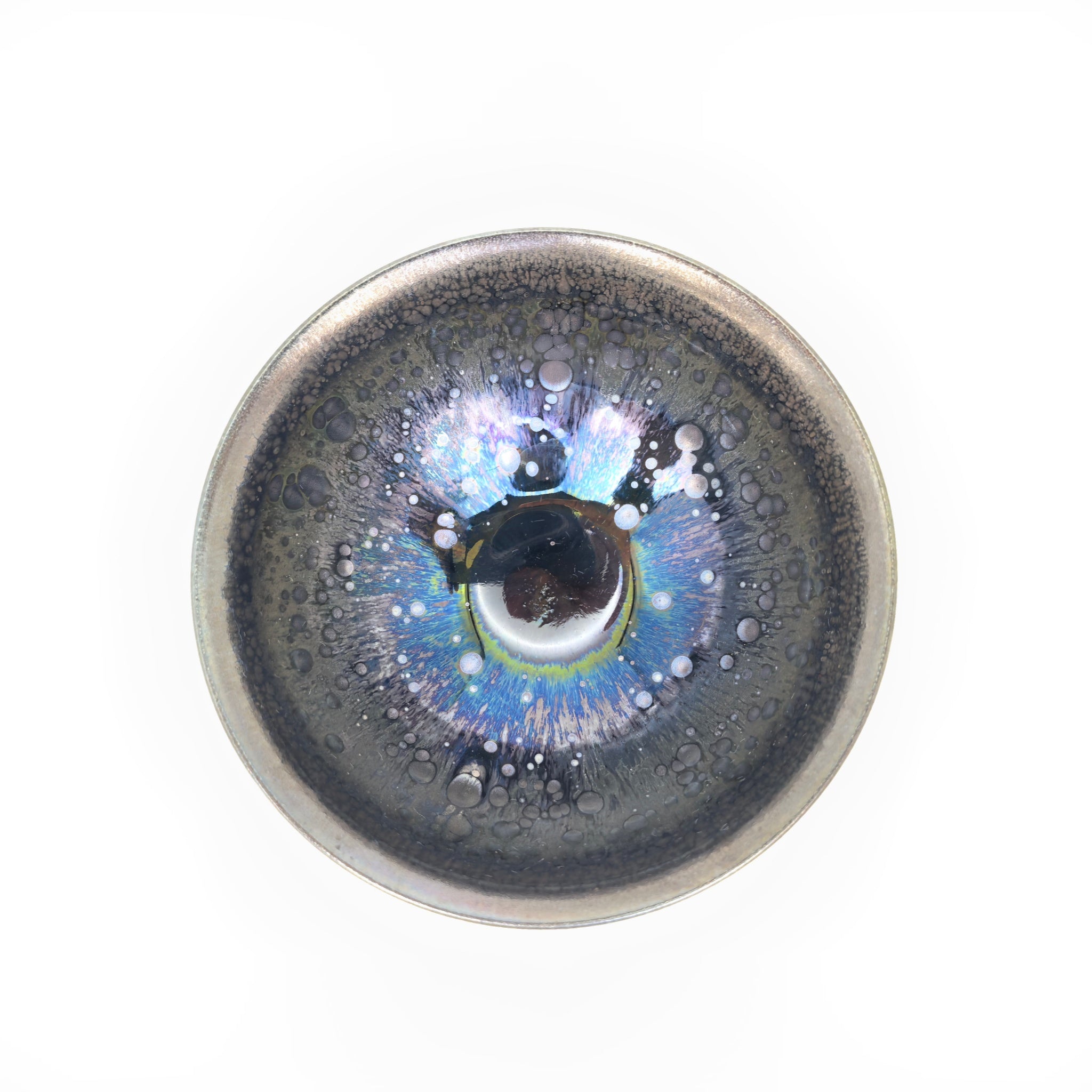 This Jian Zhan teacup features a brilliant blue glaze, with circular patterns shimmering inside that resemble the electric arcs and energy bursting from Zeus's thunderbolt. Capturing the mythical power and splendor within a small space, the cup is aptly named after this divine phenomenon.
