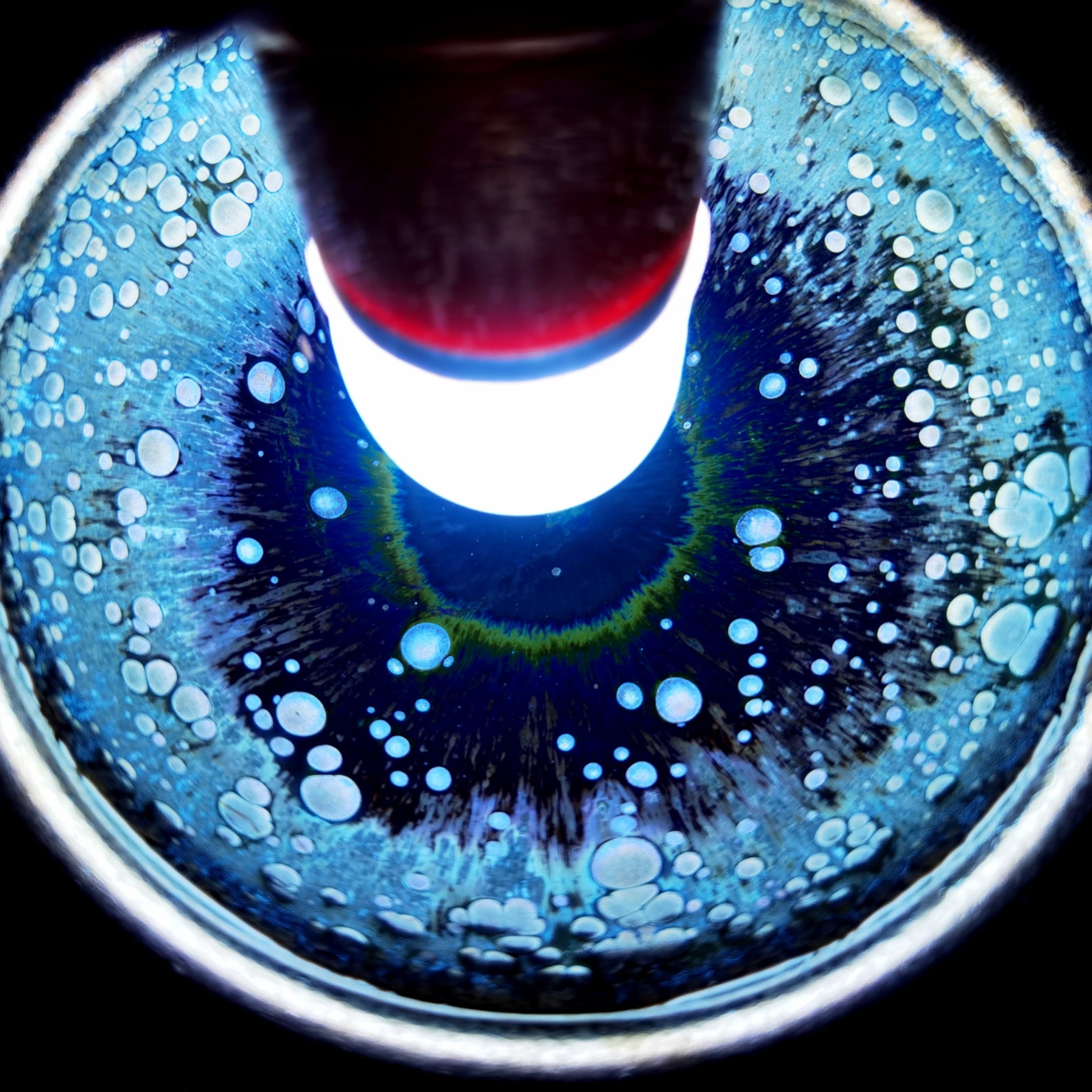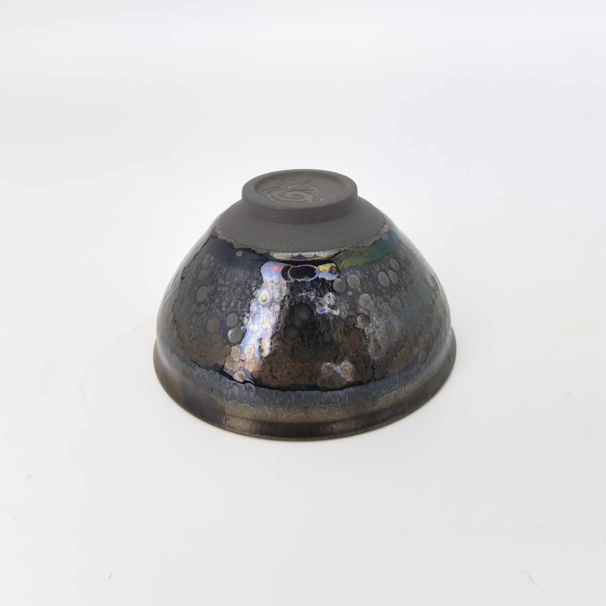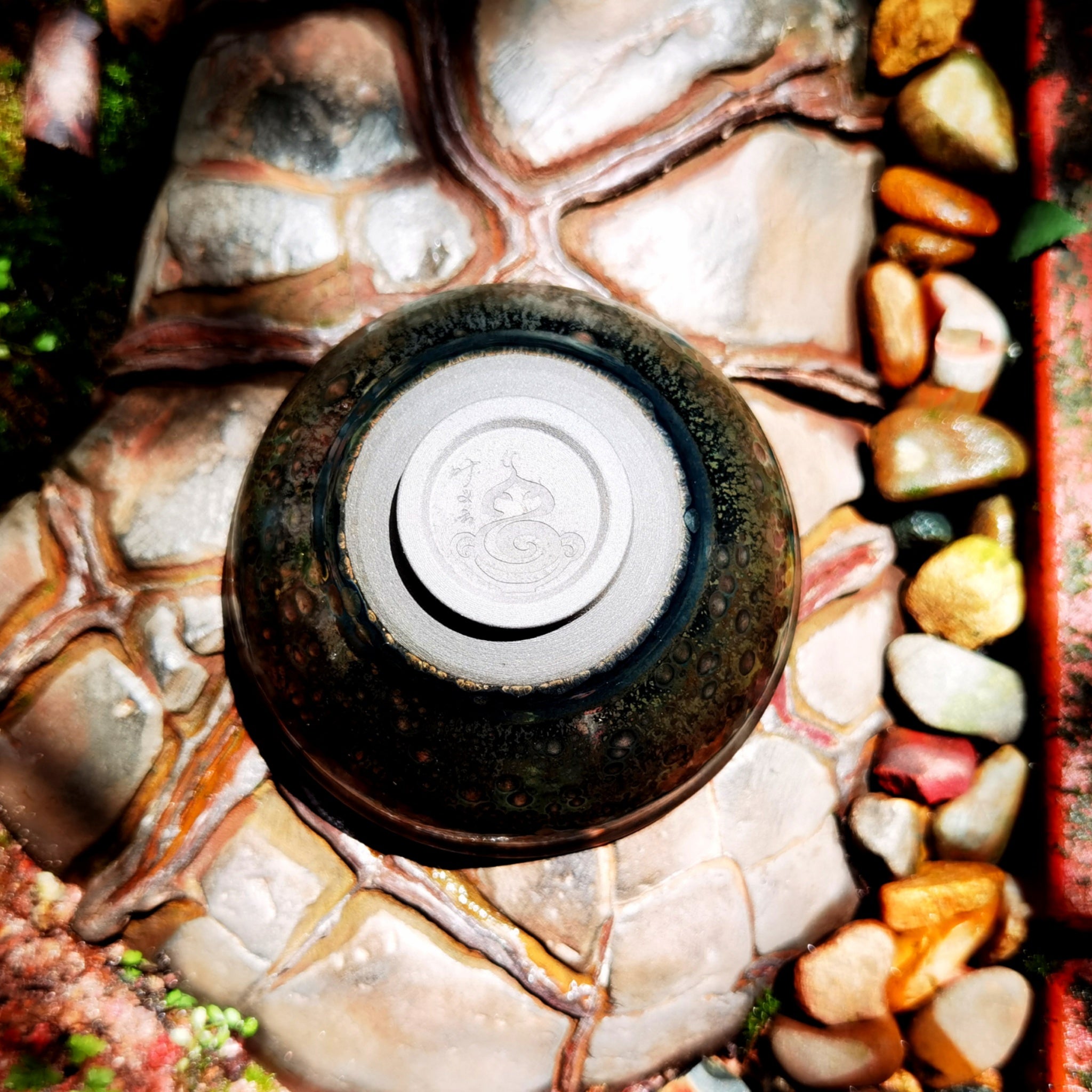 Through carefully controlled oxygen intake, stunning natural patterns emerge—reminiscent of meteorite craters and cosmic auroras. The deep black glaze transitions gently to a jade-like rim, with lush glaze texture and dramatic dripping effects. What makes each cup truly one-of-a-kind are the vibrant and unpredictable colors formed by mineral traces and firewood elements reacting under intense heat. Its position in the kiln further shapes its unique visual story—making no two pieces alike.