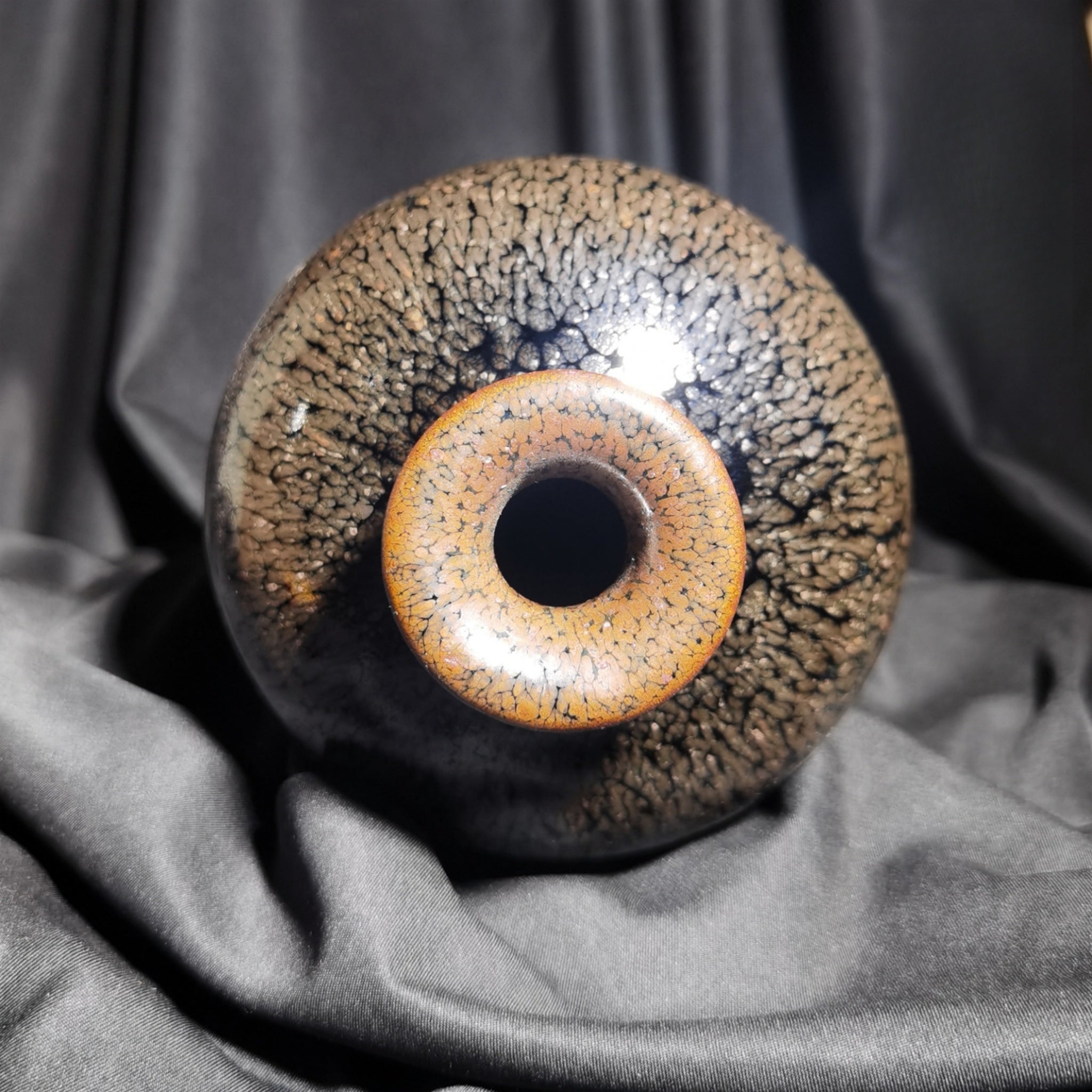 The Yunluoxing·Beauty's Intoxication Meiping (Plum Vase) from Yunzhanxuan features a deep, rustic black-blue glaze base adorned with flawlessly rounded oil spots and partridge markings. Its colors are enchanting, the texture exceptional, and the glaze rich and lustrous with excellent vitrification, creating a pronounced sense of fluidity.
